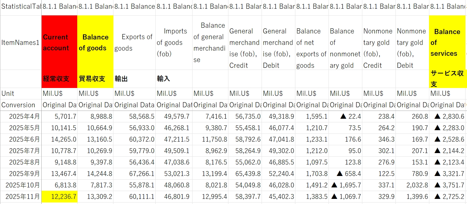 2026年01月09日、『韓国銀行』が「2025年11月の国際収支統計」を公表しました。経常収支は以下のようになりました。