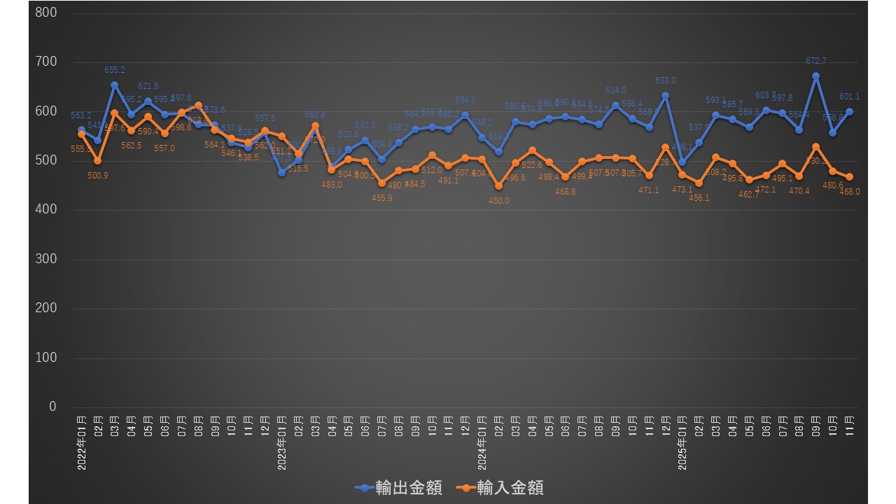 2022年01月~2025年11月の(国際収支統計における)輸出金額・輸入金額の推移をグラフにすると以下のようになります。貿易収支は「輸出 – 輸入」で求めます。