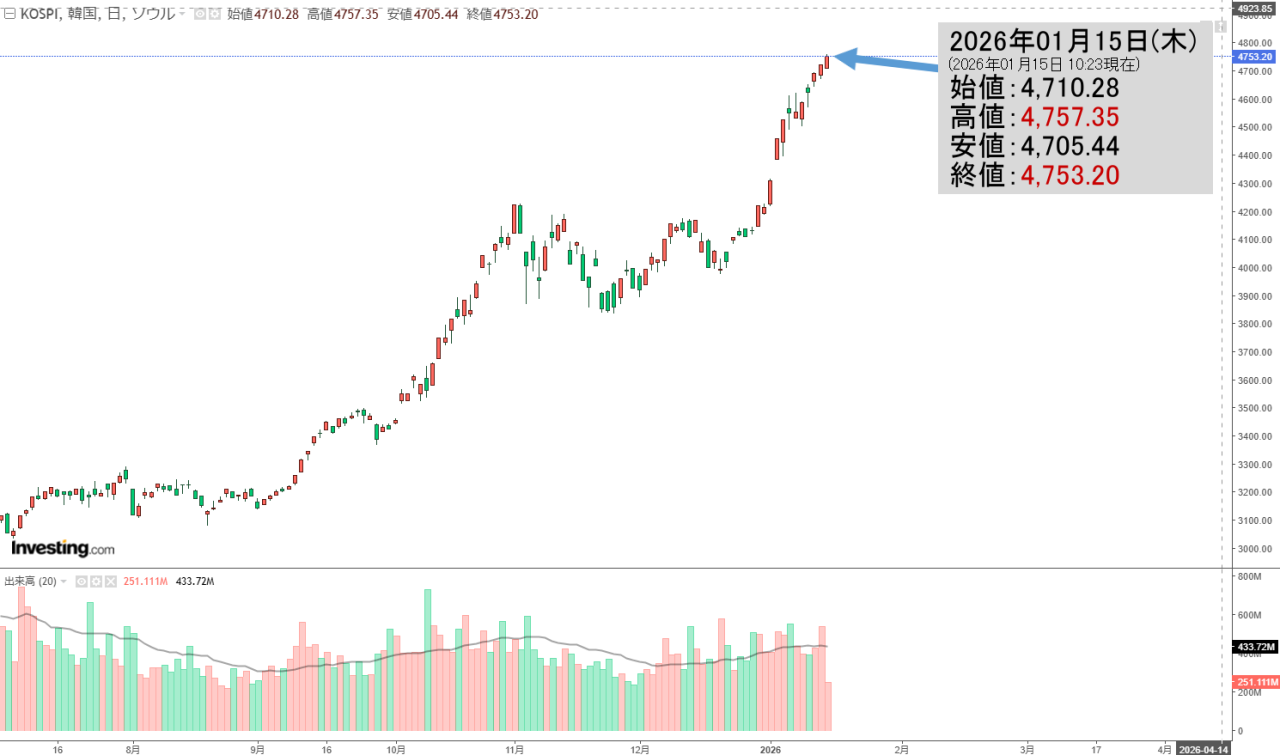 2026年01月15日(木)の韓国株式市場が開きました。10:23現在、KOSPI(韓国総合株価指数)のチャートは以下のようになっています(チャートは『Investing.com』より引用)。