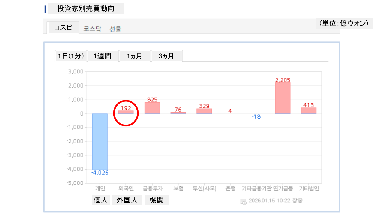 個人投資家は「4,026億ウォン」の売り越し。一方の外国人投資家は「192億ウォン」の買い越しです。