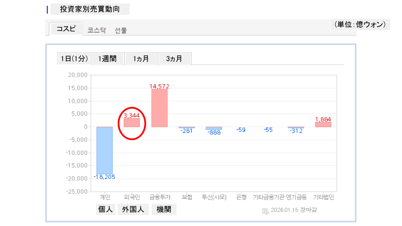 個人投資家は「1兆8,205億ウォン」の売り越し。一方の外国人投資家は「3,344億ウォン」の買い越しです。