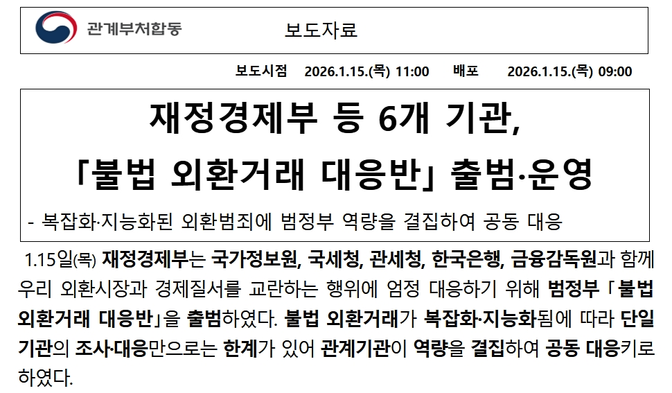 01月15日(木)、財政経済部は、国家情報院、国税庁、関税庁、『韓国銀行』、金融監督院とともに、わが国の外為市場および経済秩序を攪乱する行為に厳正に対応するため、汎政府「不法外為取引対応班」を発足させた。