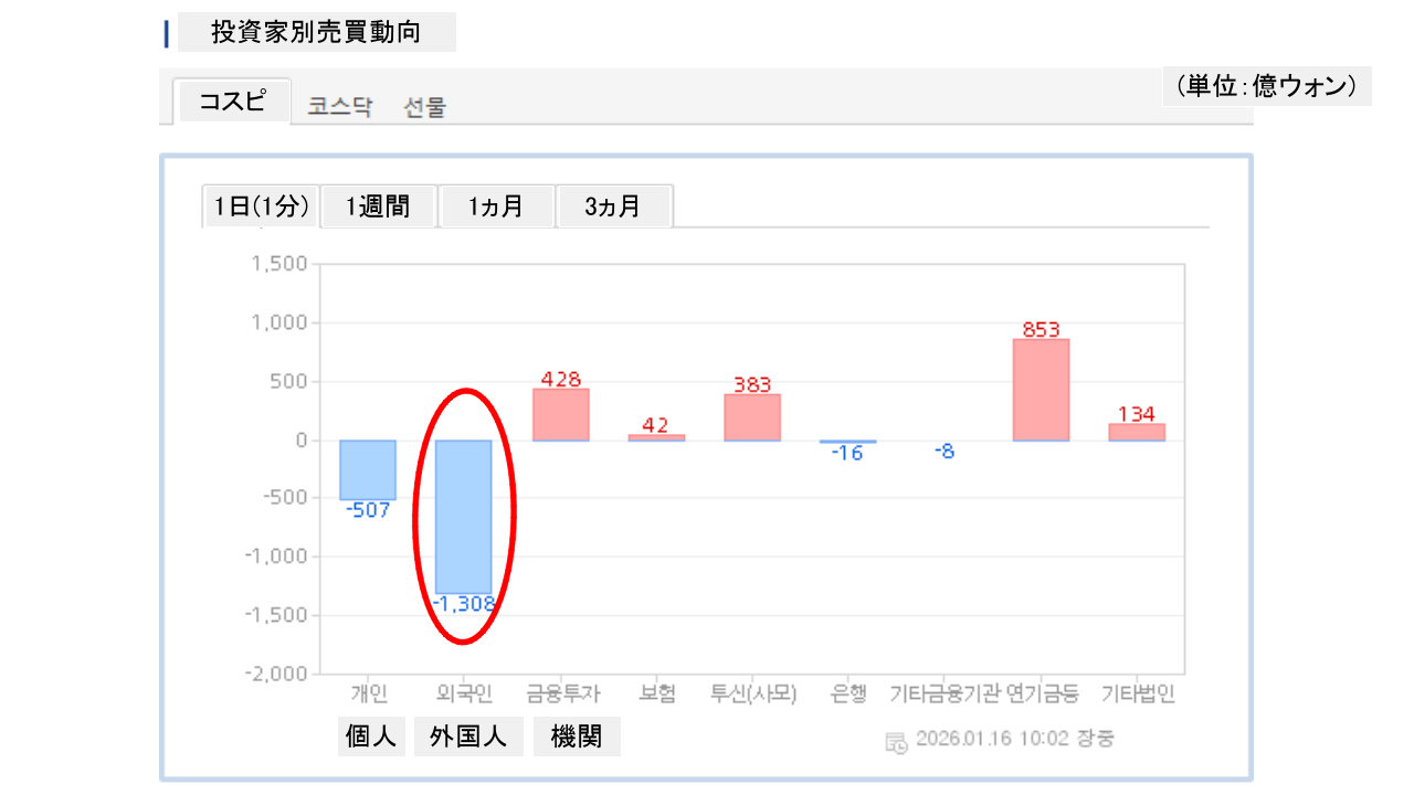 個人投資家は「507億ウォン」の売り越し。一方の外国人投資家は「1,308億ウォン」の売り越しです。