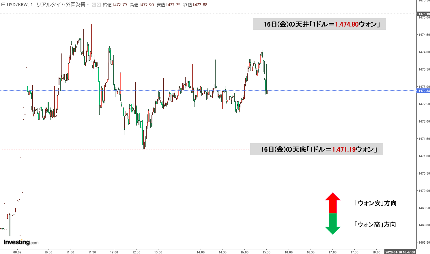 2026年01月16日(金)15:30現在、ドルウォンのチャートは以下のようになっています(チャートは『Investing.com』より引用)。