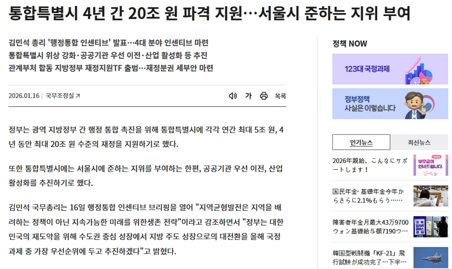 政府は、広域地方政府間の行政統合を促進するため、統合特別市に対し、それぞれ年間最大5兆ウォン、4年間で最大20兆ウォン規模の財政支援を行うことを決定した。
