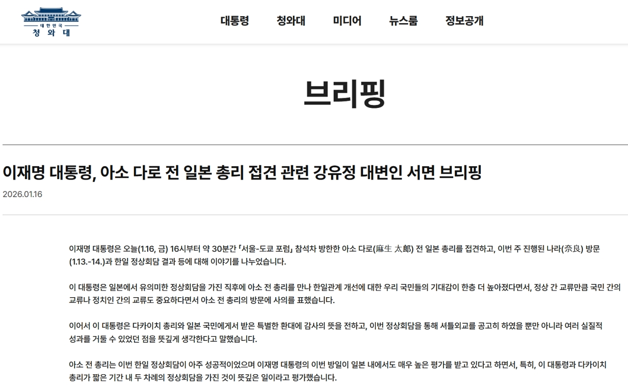 李在明大統領は本日(01月16日、金)16時から約30分間、「ソウル―東京フォーラム」出席のため来韓した麻生太郎元日本首相を接見し、今週行われた奈良(奈良)訪問(01月13日~14日)および日韓首脳会談の結果などについて意見を交わしました。