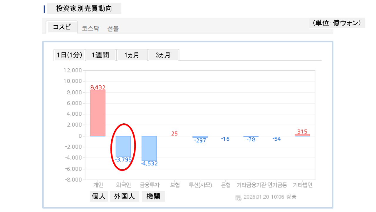個人投資家は「8,432億ウォン」の買い越し。一方の外国人投資家は「3,795億ウォン」の売り越しです。