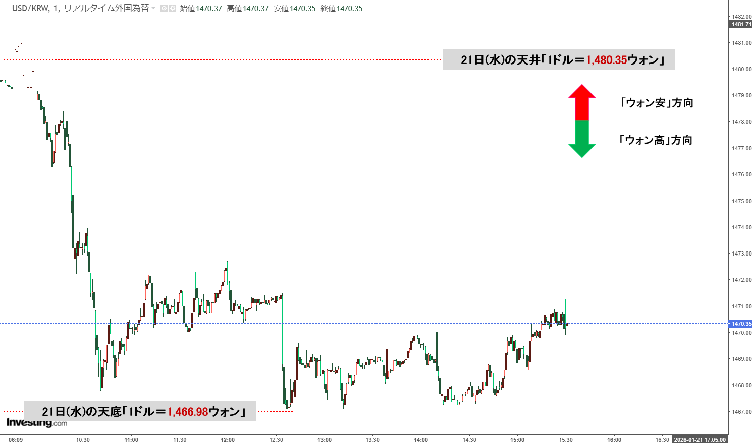 「ドルウォン」21日(水)夕刻・「1,470ウォン」陰転。