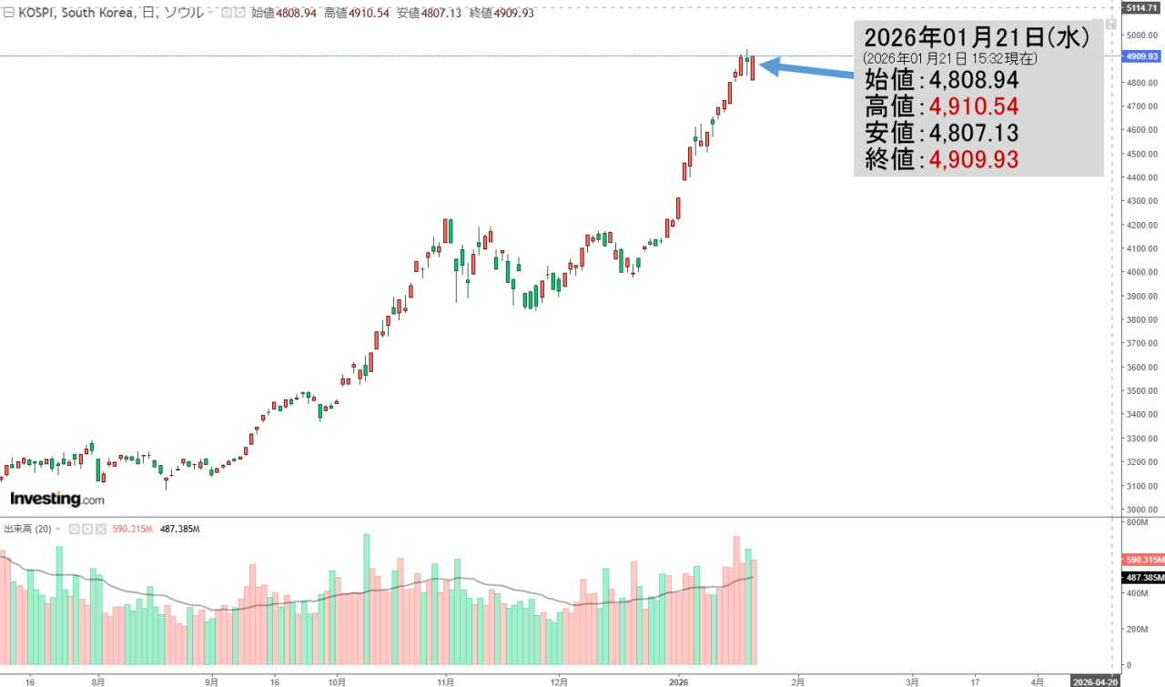 2026年01月21日(水)の韓国株式市場が締まりました。15:32現在、KOSPI(韓国総合株価指数)のチャートは以下のようになっています(チャートは『Investing.com』より引用)。