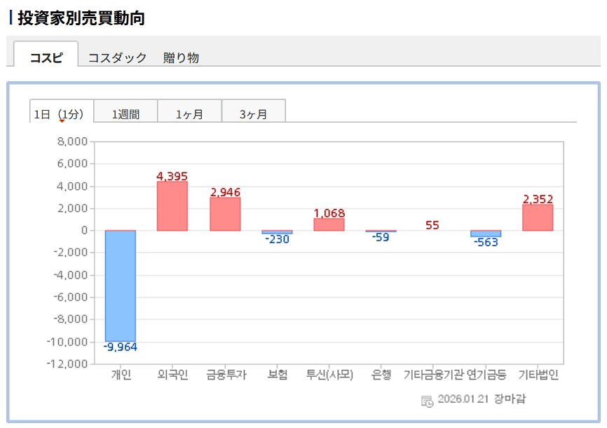 個人投資家は「9,964億ウォン」の売り越し。一方の外国人投資家は「4,395億ウォン」の買い越しです。