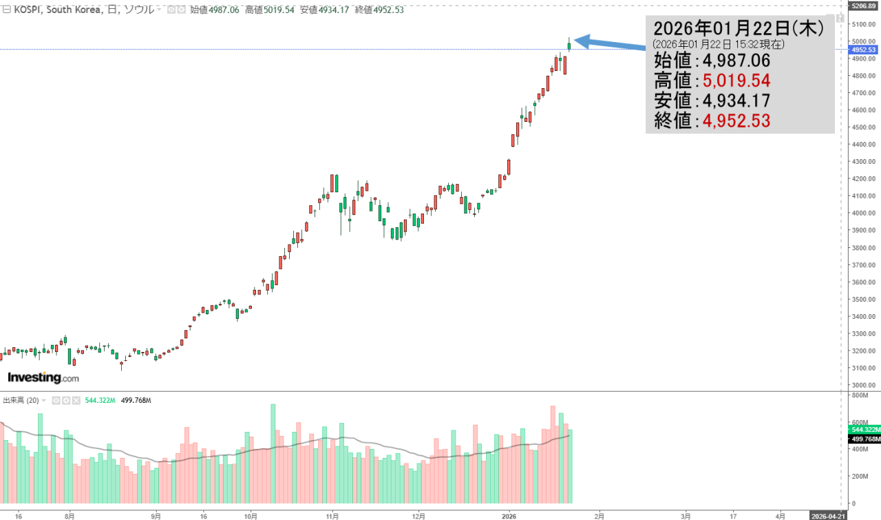 2026年01月22日(木)の韓国株式市場が締まりました。15:32現在、KOSPI(韓国総合株価指数)のチャートは以下のようになっています(チャートは『Investing.com』より引用)。