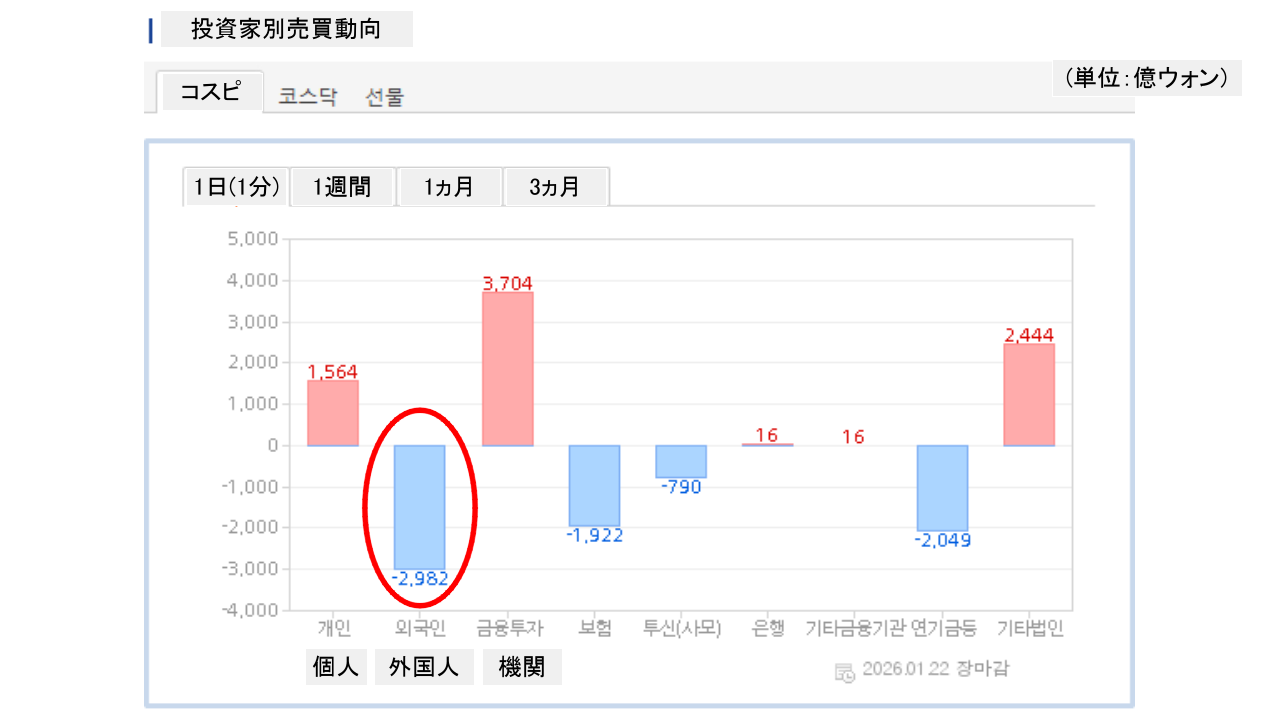 個人投資家は「1,564億ウォン」の買い越し。一方の外国人投資家は「2,982億ウォン」の売り越しです。