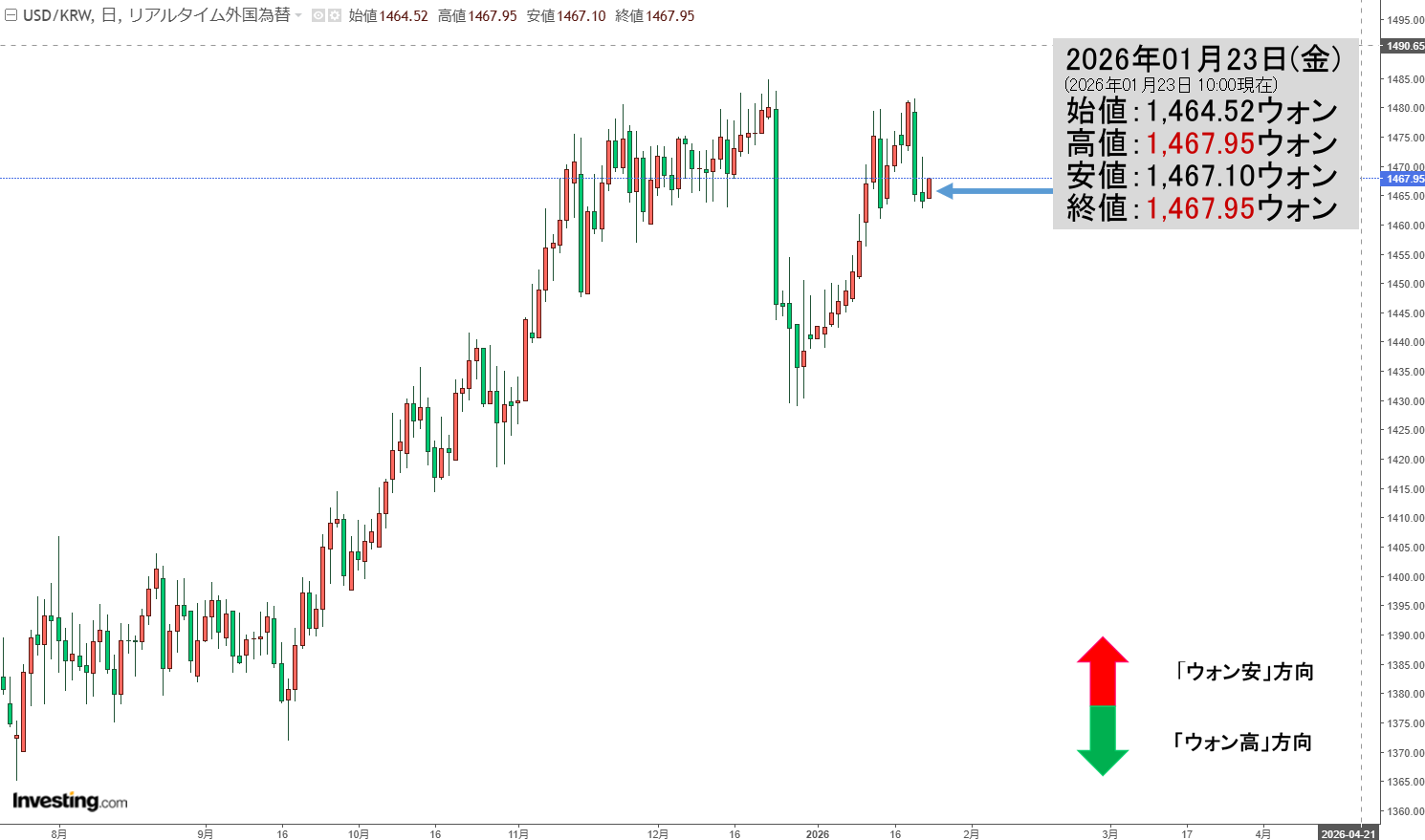 現在の天井は「1ドル=1,467.95ウォン」、天底は「1ドル=1,467.10ウォン」です。