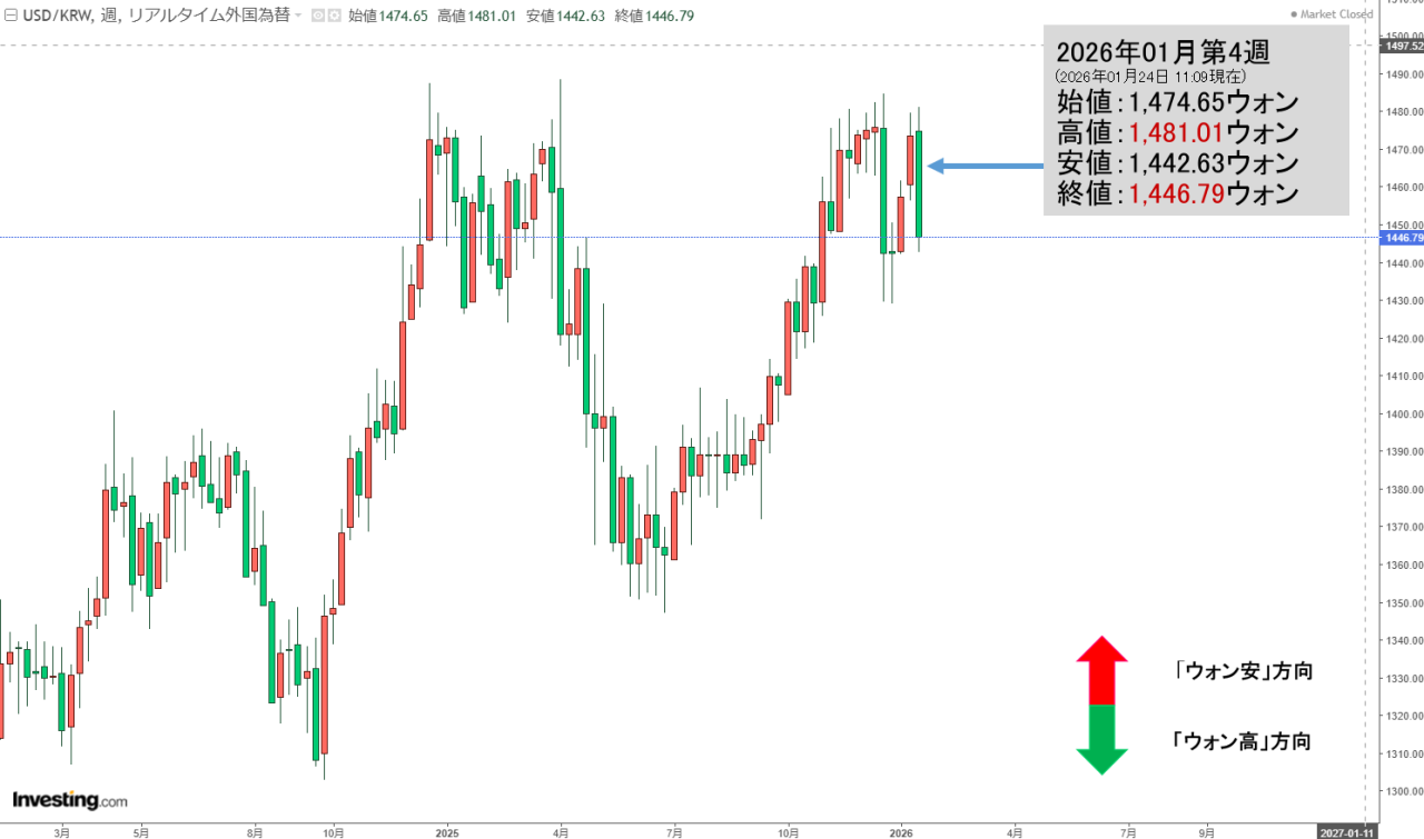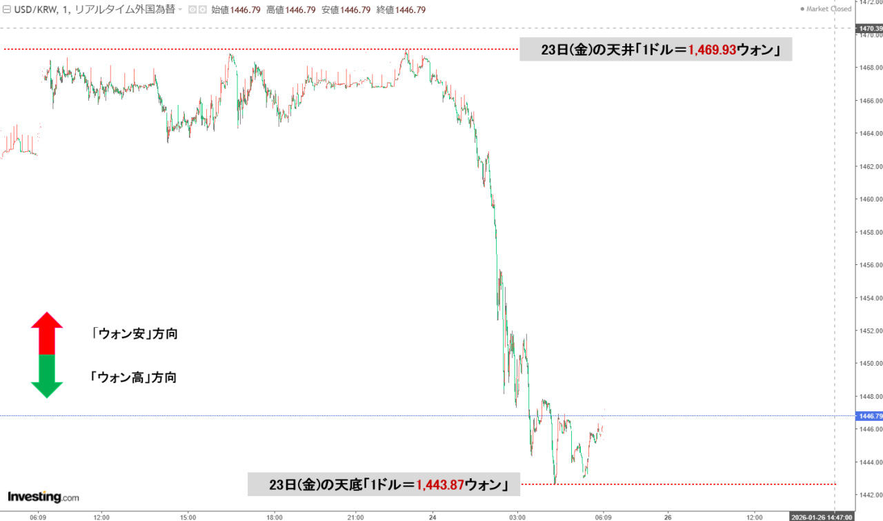 2026年01月23日(金)が(ほぼほぼ)締まりました。2026年01月24日 11:12現在、ドルウォンチャートは以下のようになっています(チャートは『Investing.com』より引用:以下同)。