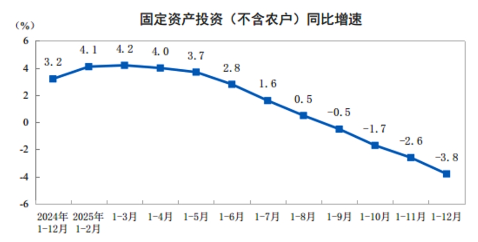 対前月比で見ると、12月の固定資産投資(農村世帯を除く)は1.13%減少した。
