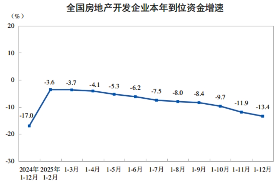 2025年、不動産開発企業の利用可能資金は9兆3,117億元で、対前年同期比13.4%減少した。