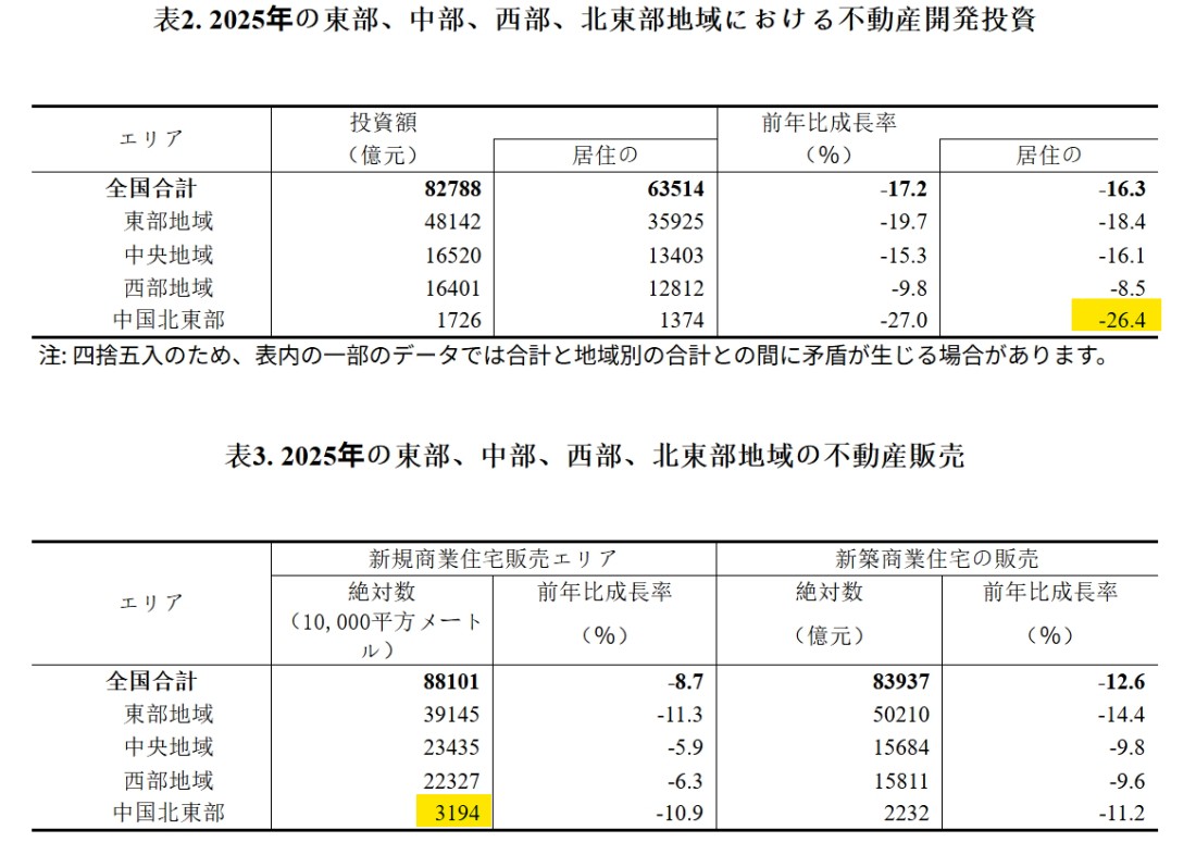 中国の東北部では、不動産開発に投資される資金が対前年同期比で「-26.4%」も急減しています。