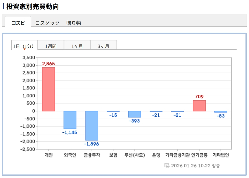 個人投資家は「2,866億ウォン」の買い越し。一方の外国人投資家は「1,146億ウォン」の売り越しです。