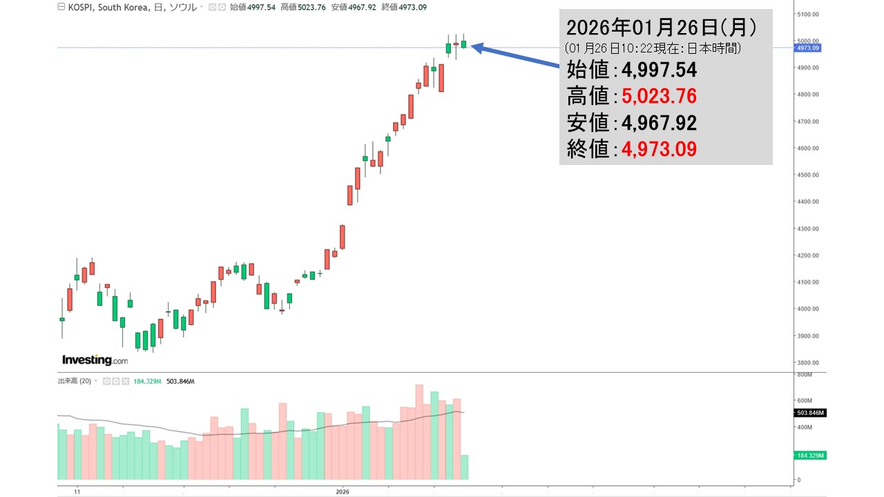 2026年01月23日(金)の韓国株式市場が開きました。10:22現在、KOSPI(韓国総合株価指数)のチャートは以下のようになっています(チャートは『Investing.com』より引用)。