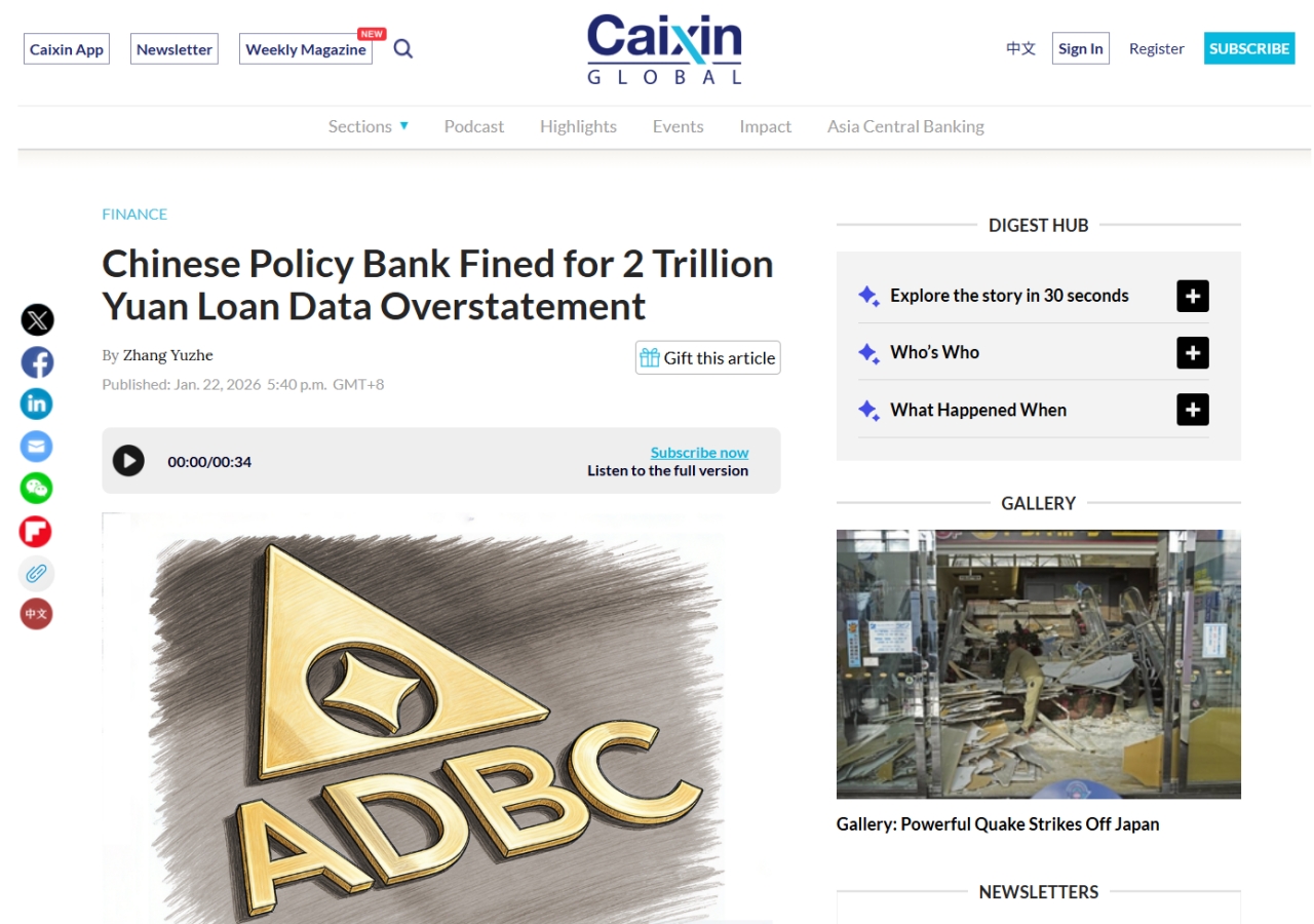 ↑有料記事ですがタイトルは「Chinese Policy Bank Fined for 2 Trillion Yuan Loan Data Overstatement(中国の政策銀行、融資データの2兆元過大計上で罰金を科される)」です/紙面のスクリーンキャプチャー⇒参照・引用元:『財新』「Chinese Policy Bank Fined for 2 Trillion Yuan Loan Data Overstatement」