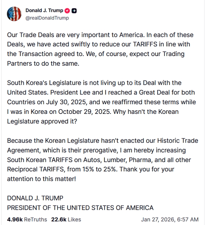 韓国の立法府が、彼らの権限の範囲内とはいえ、われわれの歴史的な貿易協定を制定・発効させていないため、私はここに、自動車、木材、医薬品、ならびにその他すべての相互関税について、韓国に対する関税を15%から25%へ引き上げる。