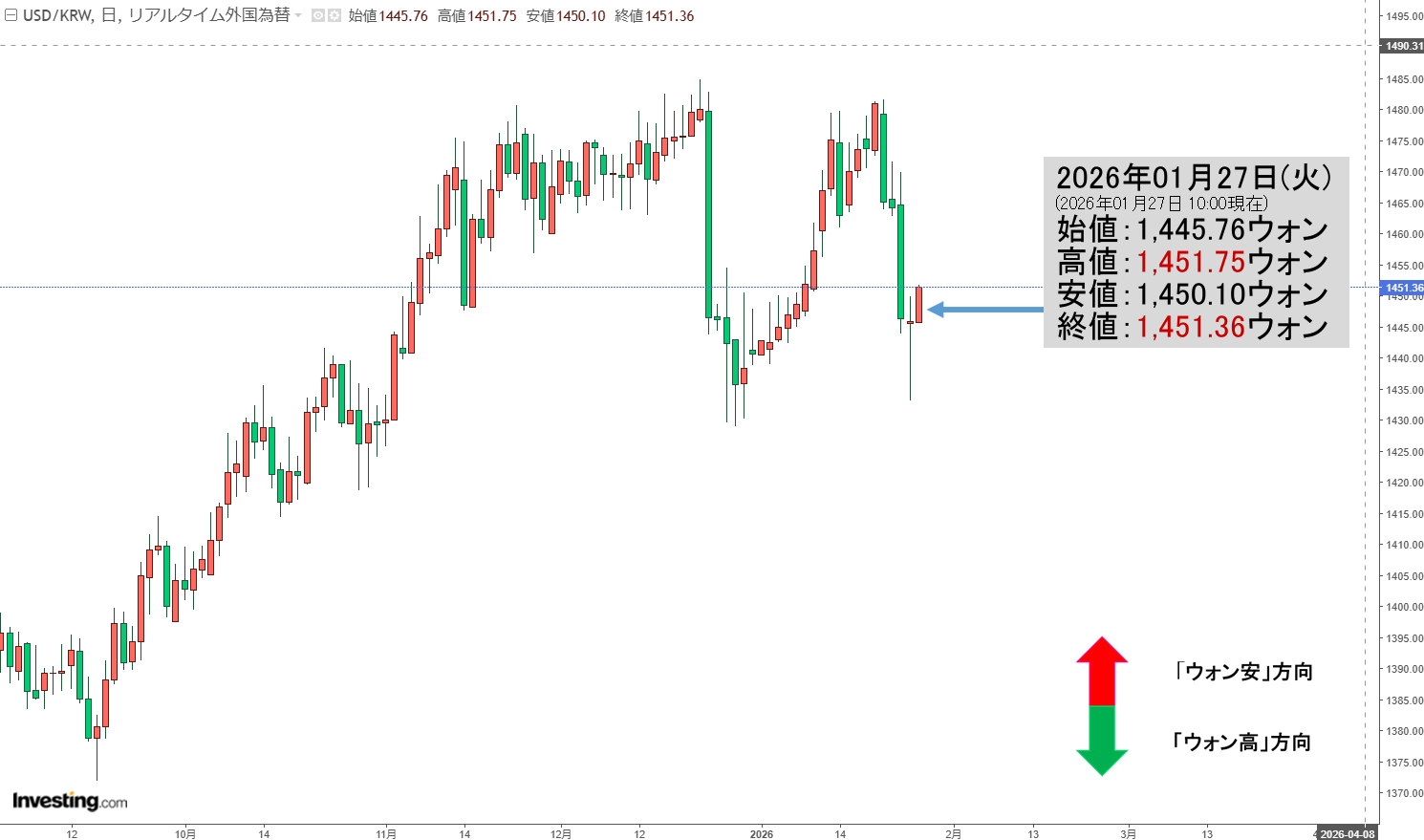 2026年01月27日(火)の市場が開きました。10:00現在、ドルウォンのチャートは以下のようになっています(チャートは『Investing.com』より引用)。