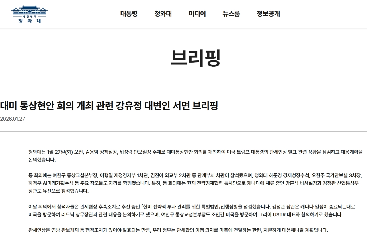 青瓦台は01月27日(火)午前、金容範(キム・ヨンボム)政策室長、魏聖洛(ウィ・ソンナク)安保室長主宰の下、対米通商懸案会議を開催し、合衆国のドナルド・トランプ大統領による関税引き上げ発表に関連する状況を点検し、対応計画を協議した。