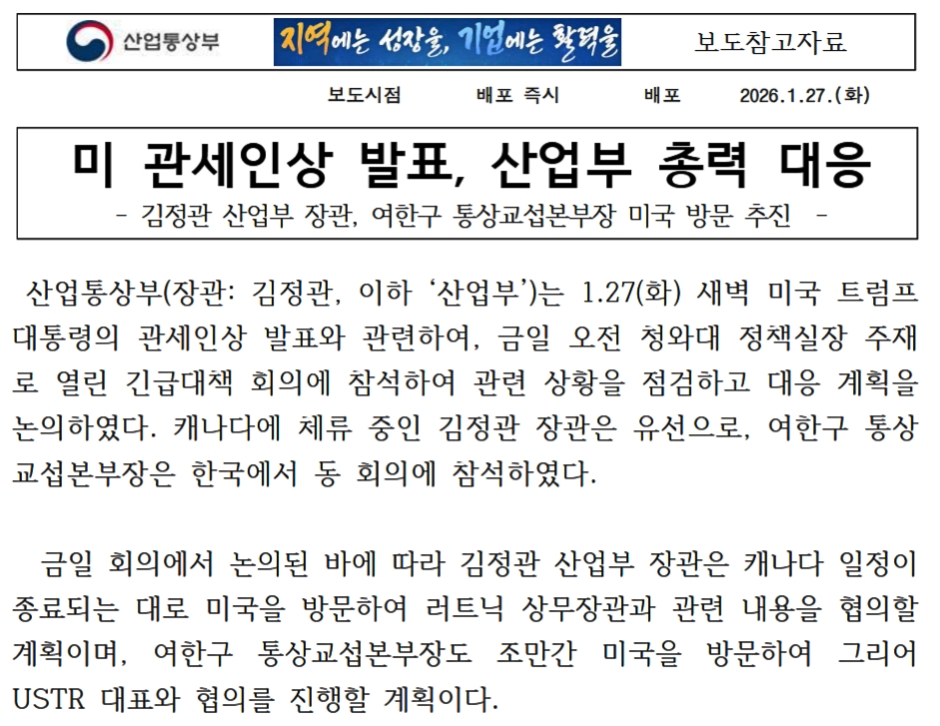 先にご紹介したとおり、また「政府高官が急遽渡米」な事態になっており、以下が2026年01月27日に産業通商資源部が出したプレスリリースです。