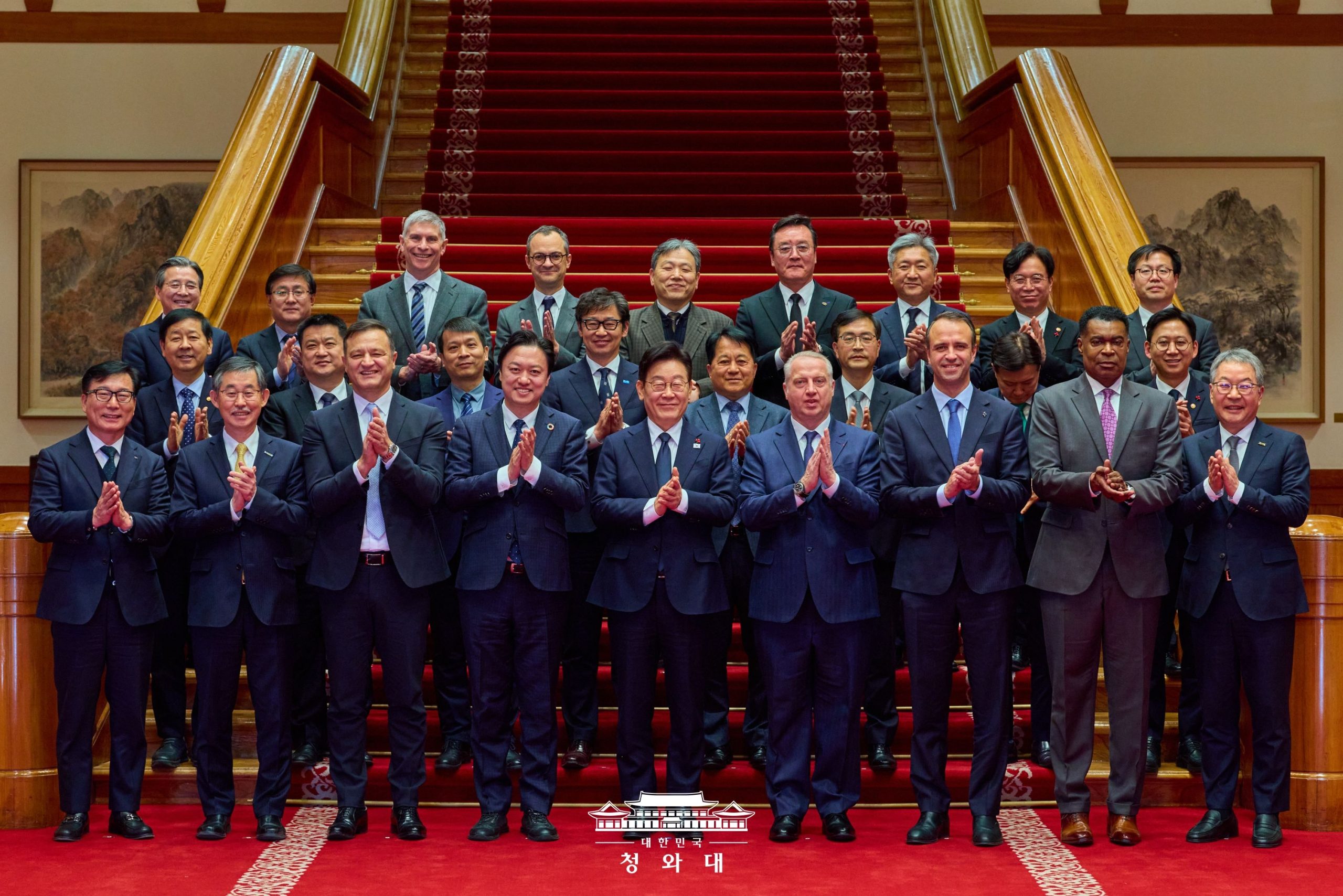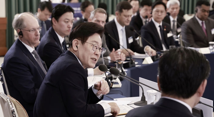 ↑2026年01月28日、李在明(イ・ジェミョン)さんが主宰した「外国人投資企業懇談会」。後ろの大きなパネルには「세계의 투자,청년의 도약,지역의 성장(世界の投資、青年の飛躍、地域の成長)」、「외국인투자를 통해 기업과 청년, 지역에 활력을 더하다(外国人投資を通じて、企業と青年、地域に活力を加える)」と書かれています。