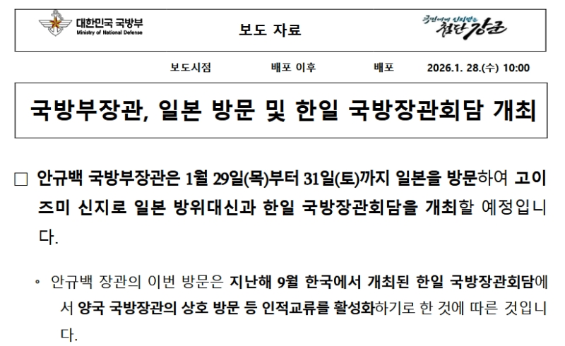 □安圭伯(アン・ギュベク)国防部長官は、01月29日(木)から31日(土)まで日本を訪問し、小泉進次郎日本防衛大臣と日韓国防長官会談を開催する予定だ。