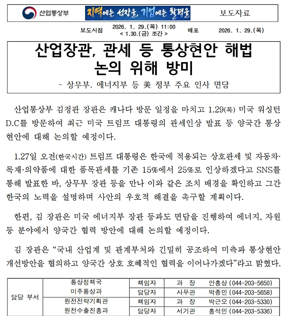 ― 商務省、エネルギー省など米政府主要人物と面談産業通商部の金正官(キム・ジョングァン)長官は、カナダ訪問日程を終え、01月29日(木)にアメリカ合衆国ワシントンD.C.を訪問し、最近のトランプ米大統領による関税引き上げ発表など、両国間の通商懸案について協議する予定である。