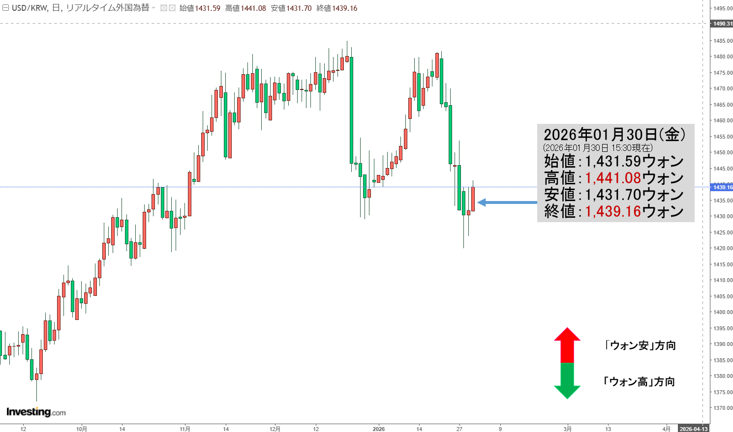 現在のところ「1ドル=1,439ウォン」近辺の攻防となっています。