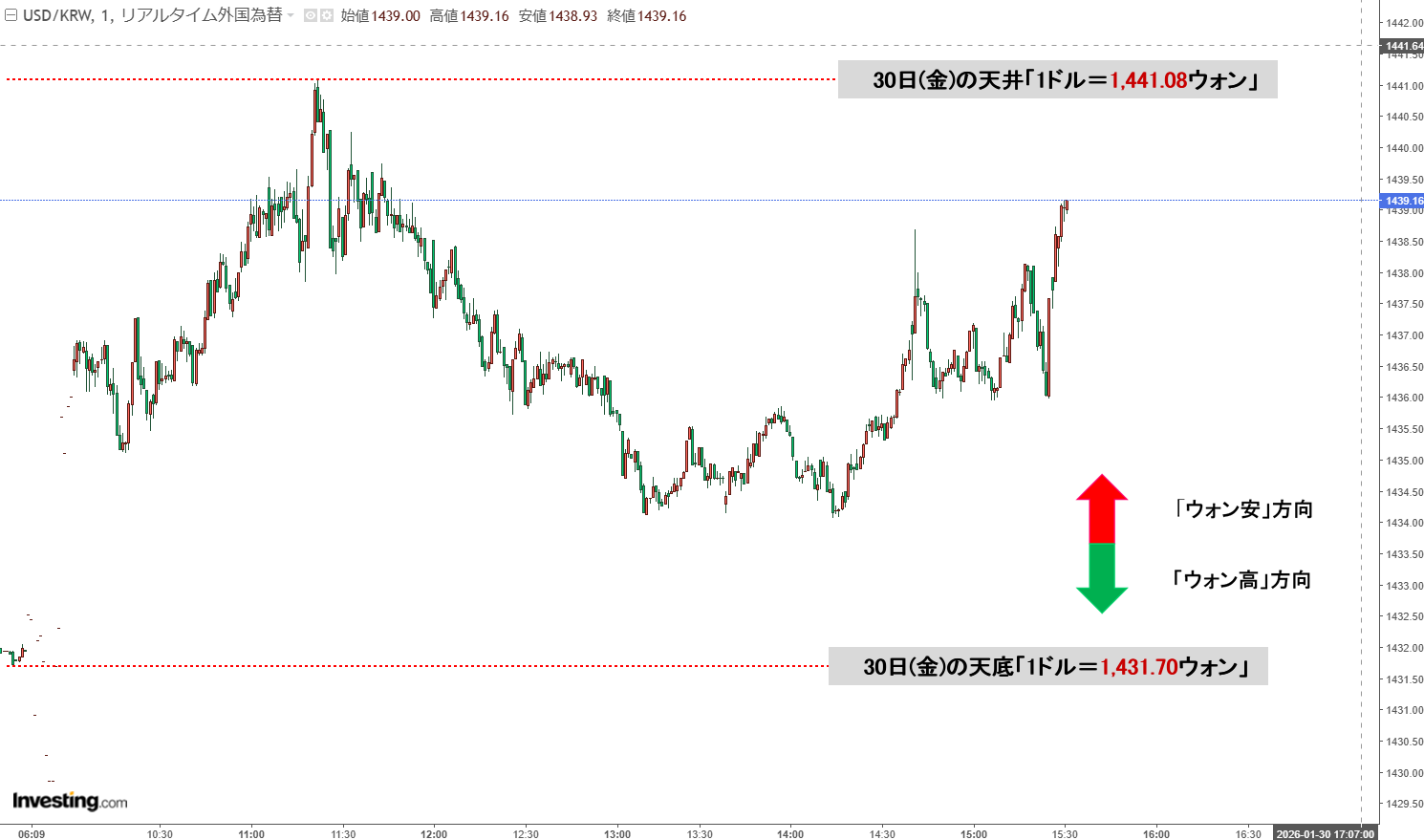 「ドルウォン」30日(金)夕刻・「1,439ウォン」陽線伸びる。