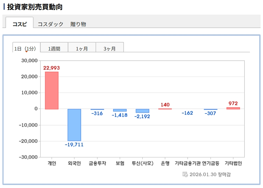 個人投資家は「2兆2,993億ウォン」の売り越し。一方の外国人投資家は「1兆9,993億ウォン」の売り越しです。