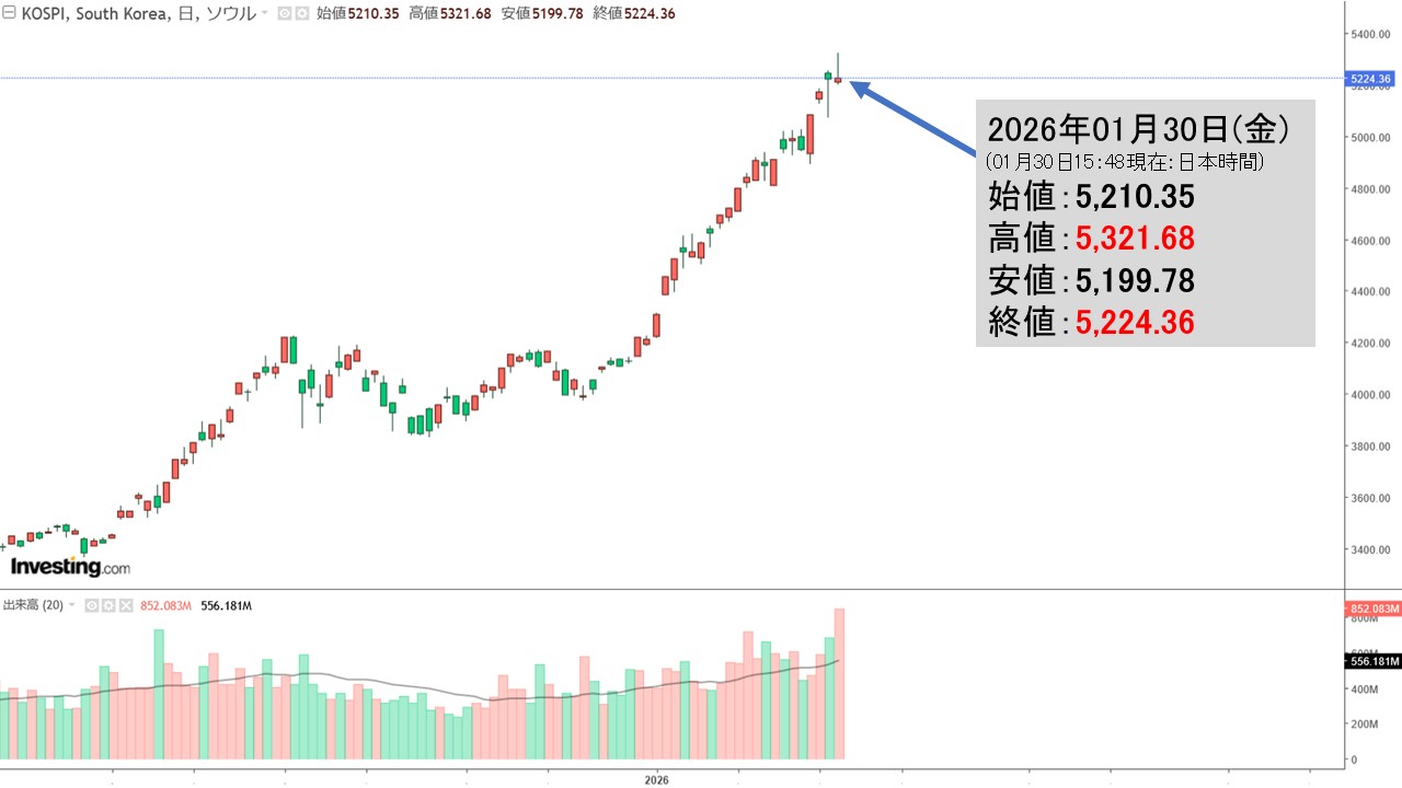 2026年01月30日(金)の韓国株式市場が締まりました。15:48現在、KOSPI(韓国総合株価指数)のチャートは以下のようになっています(チャートは『Investing.com』より引用)。