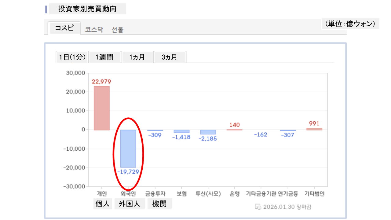 2026年01月31日(土)の韓国株式市場が開きました。00:09現在、KOSPI(韓国総合株価指数)のチャートは以下のようになっています(チャートは『Investing.com』より引用)。投資家別売買動向は以下です。⇒データ引用元:『f...