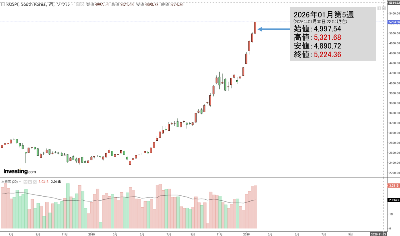 2026年01月30日(金)の韓国株式市場が締まりました。23:54現在、KOSPI(韓国総合株価指数)のチャートは以下のようになっています(チャートは『Investing.com』より引用)。