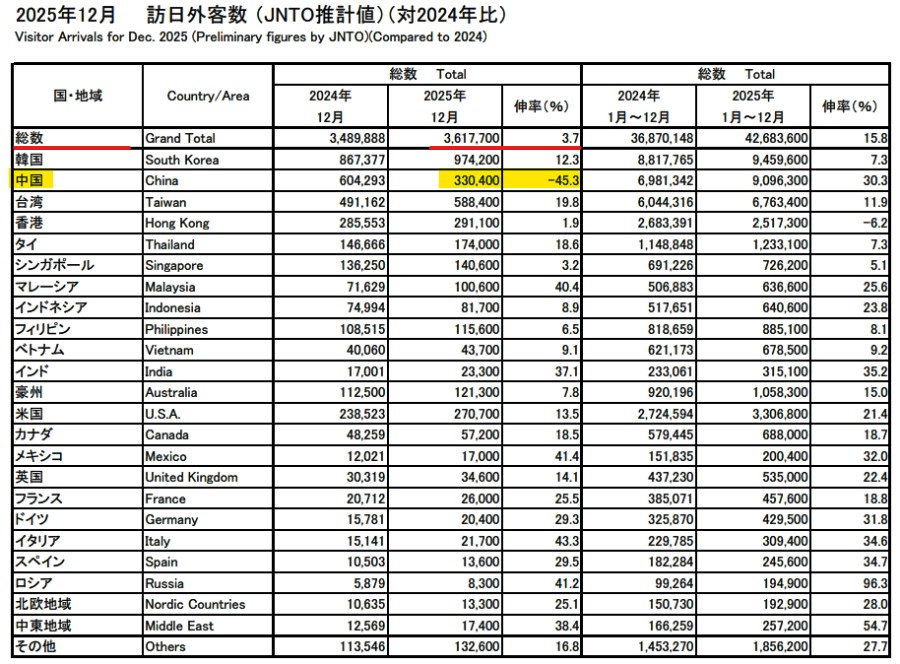 2026年01月21日、毎度おなじみの『日本政府観光局』(略称「JNTO」)が「訪日外客数(2025年12月推計値)」を公表しました。