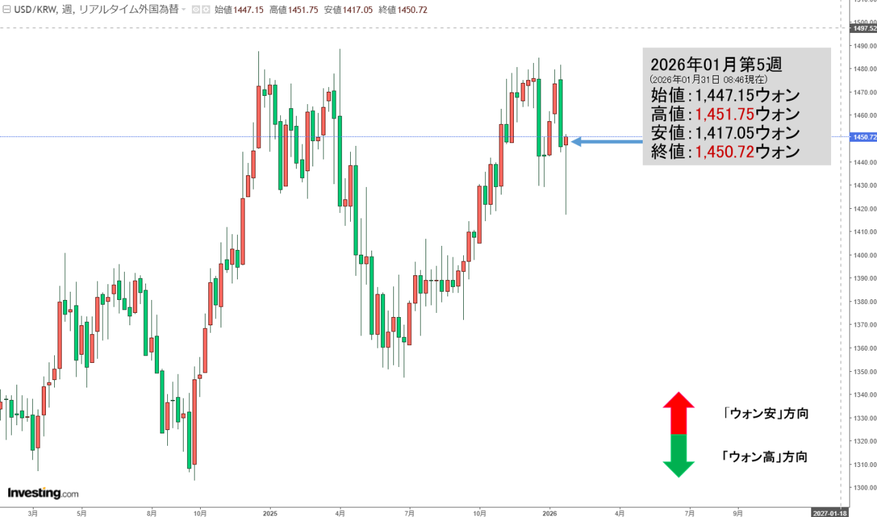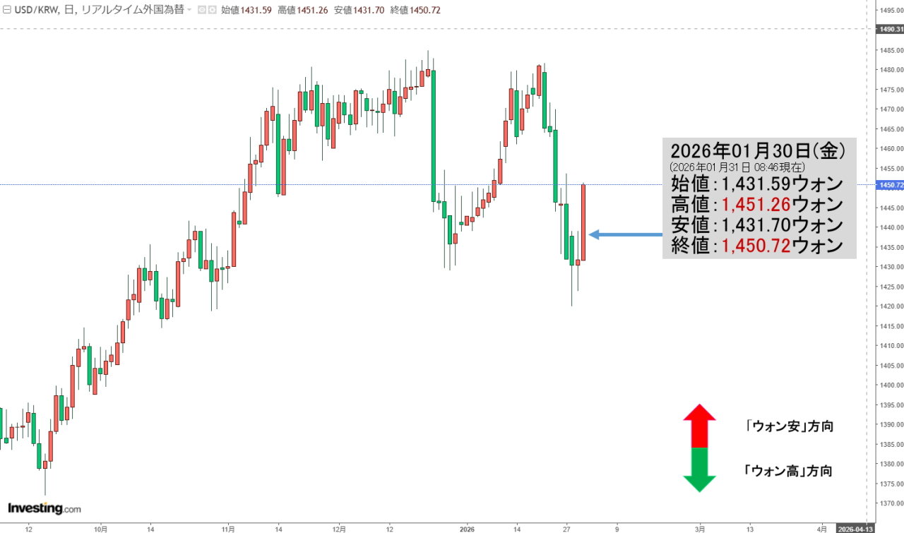 2026年01月30日(金)が(ほぼほぼ)締まりました。2026年01月31日 08:48現在、ドルウォンチャートは以下のようになっています(チャートは『Investing.com』より引用:以下同)。