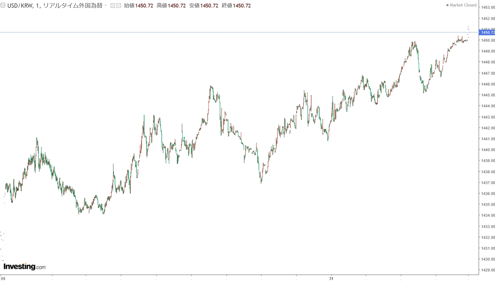 「何だこりゃ(笑)」というローソク足になりました。急激にウォン安方向に戻しました。「1ドル=1,450ウォン」で終了しました。