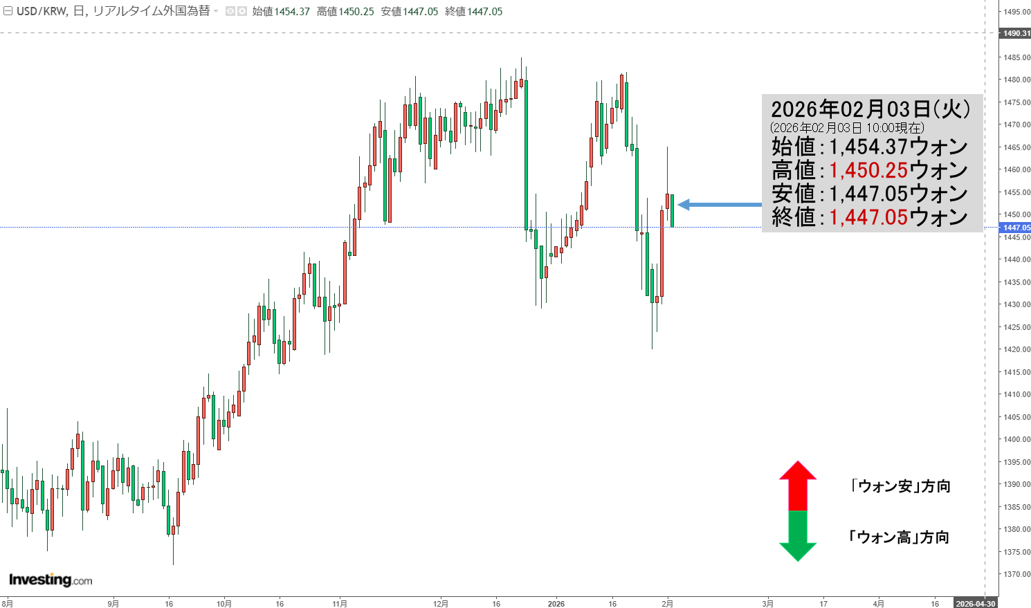 「ドルウォン」02月03日(火)初動・「1,447ウォン」陰線。
