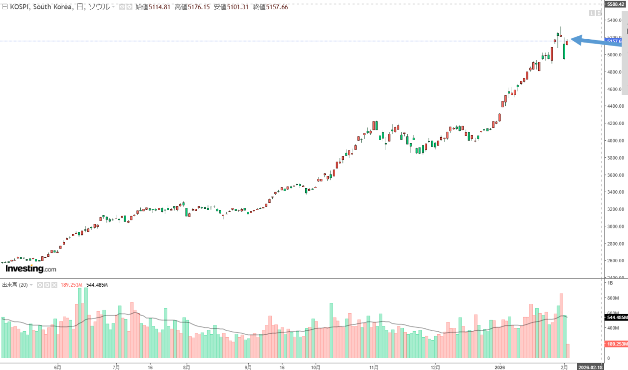 2026年02月03日(火)の韓国株式市場が開きました。10:02現在、KOSPI(韓国総合株価指数)のチャートは以下のようになっています(チャートは『Investing.com』より引用)。