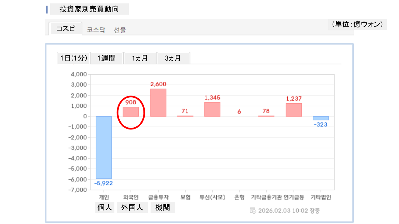 個人投資家は「5,922億ウォン」の売り越し、外国人投資家は「908億ウォン」の買い越しです。