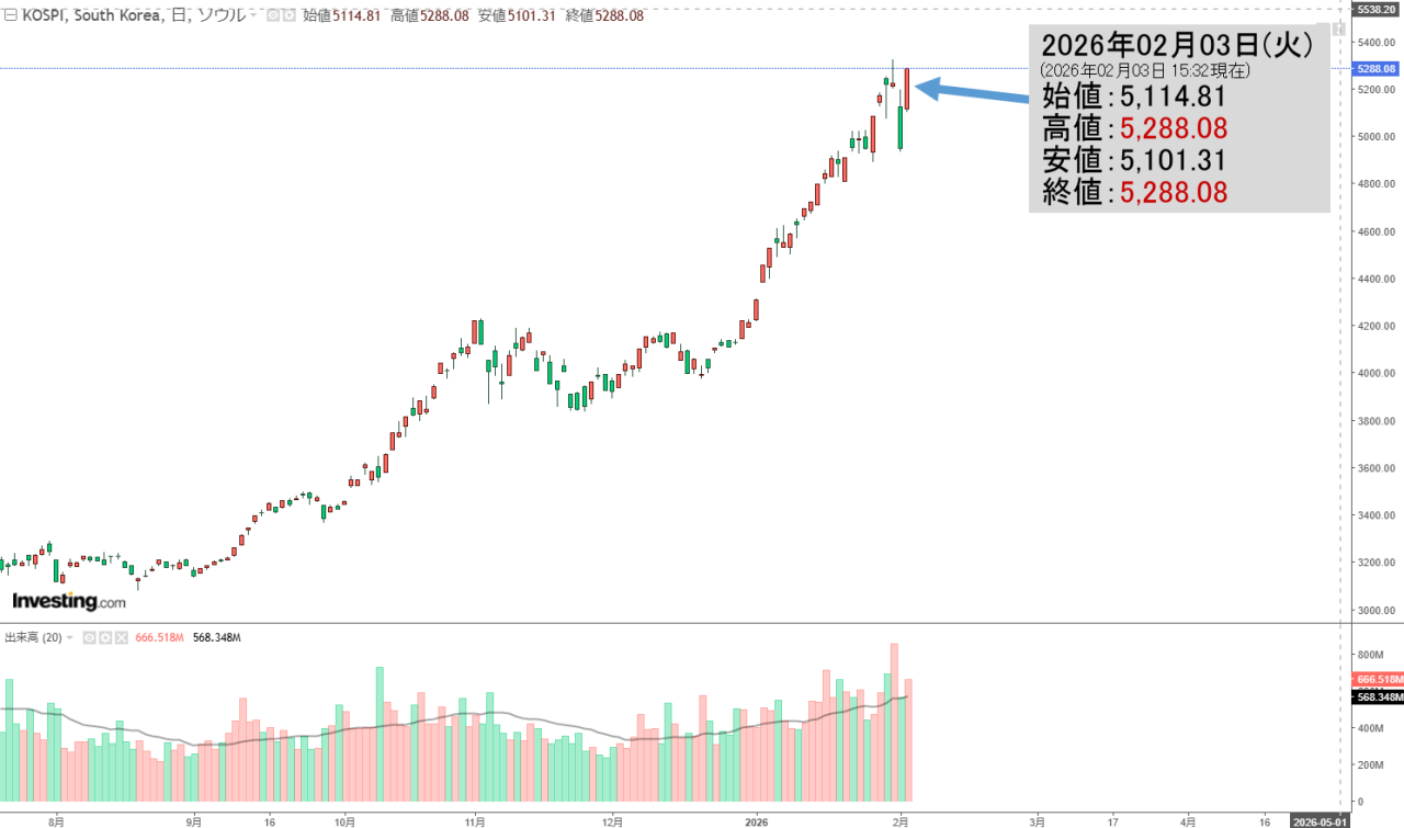 2026年02月03日(火)の韓国株式市場が締まりました。15:32現在、KOSPI(韓国総合株価指数)のチャートは以下のようになっています(チャートは『Investing.com』より引用)。