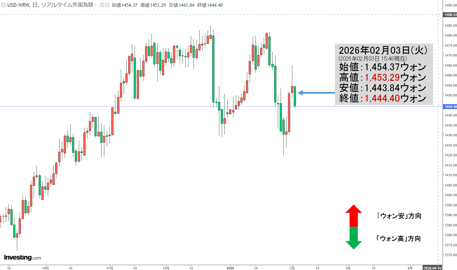 トピック2026年02月03日(火)15:48現在、ドルウォンのチャートは以下のようになっています(チャートは『Investing.com』より引用)。