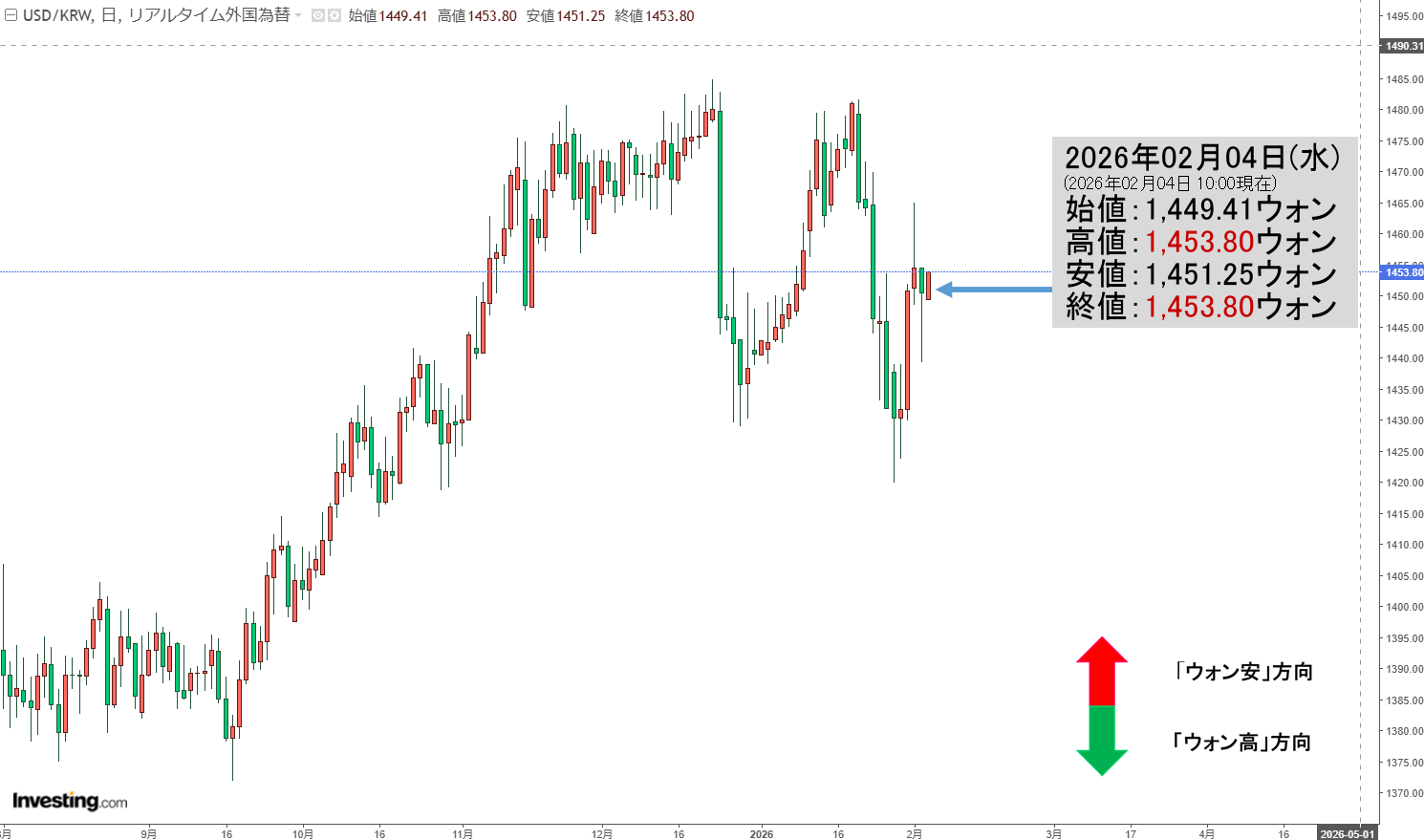 トピック2026年02月04日(水)の市場が開きました。10:00現在、ドルウォンのチャートは以下のようになっています(チャートは『Investing.com』より引用)。