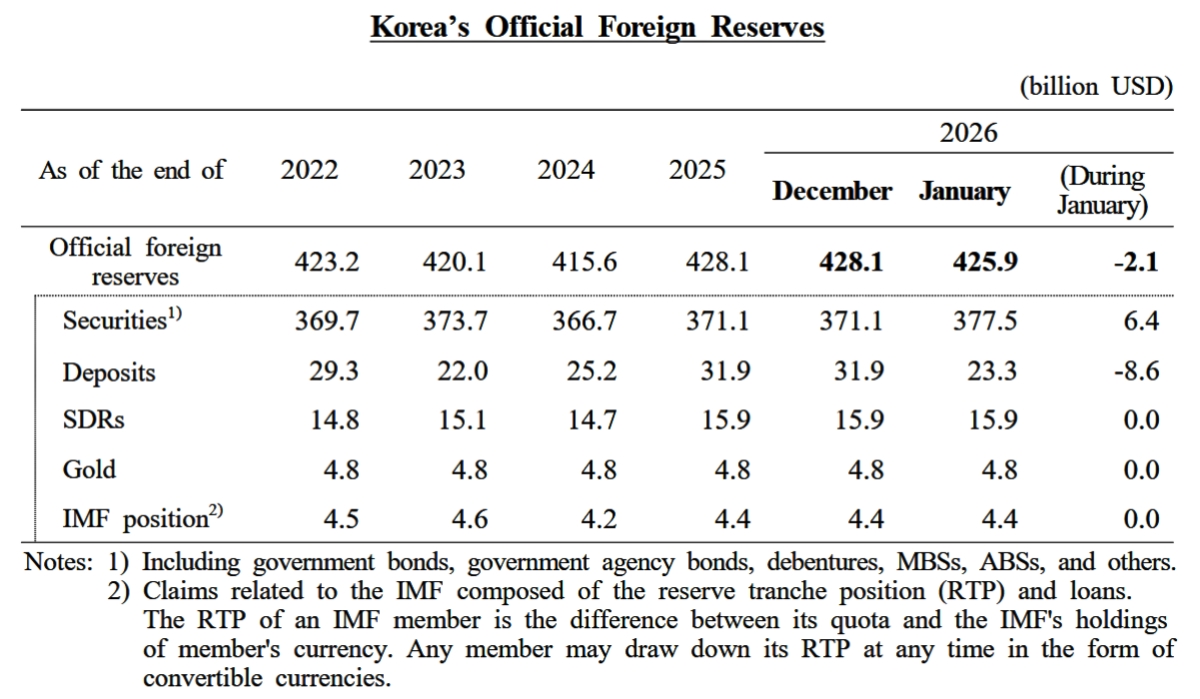 ⇒参照・引用元:『韓国銀行』公式サイト「2026년 1월말 외환보유액」