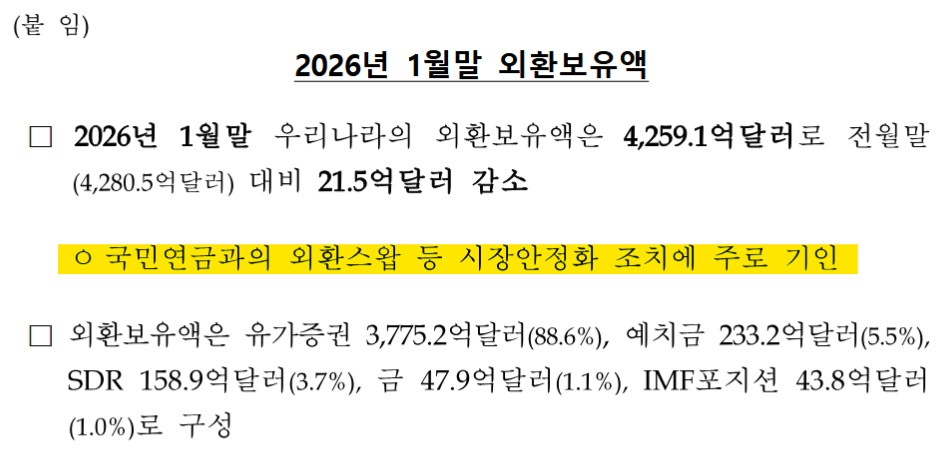 □2026年01月末時点におけるわが国の外貨準備高は4,259.1億ドルで、前月末(4,280.5億ドル)比21.5億ドル減少した。ㅇ国民年金との為替スワップなど、市場安定化措置に主として起因する。