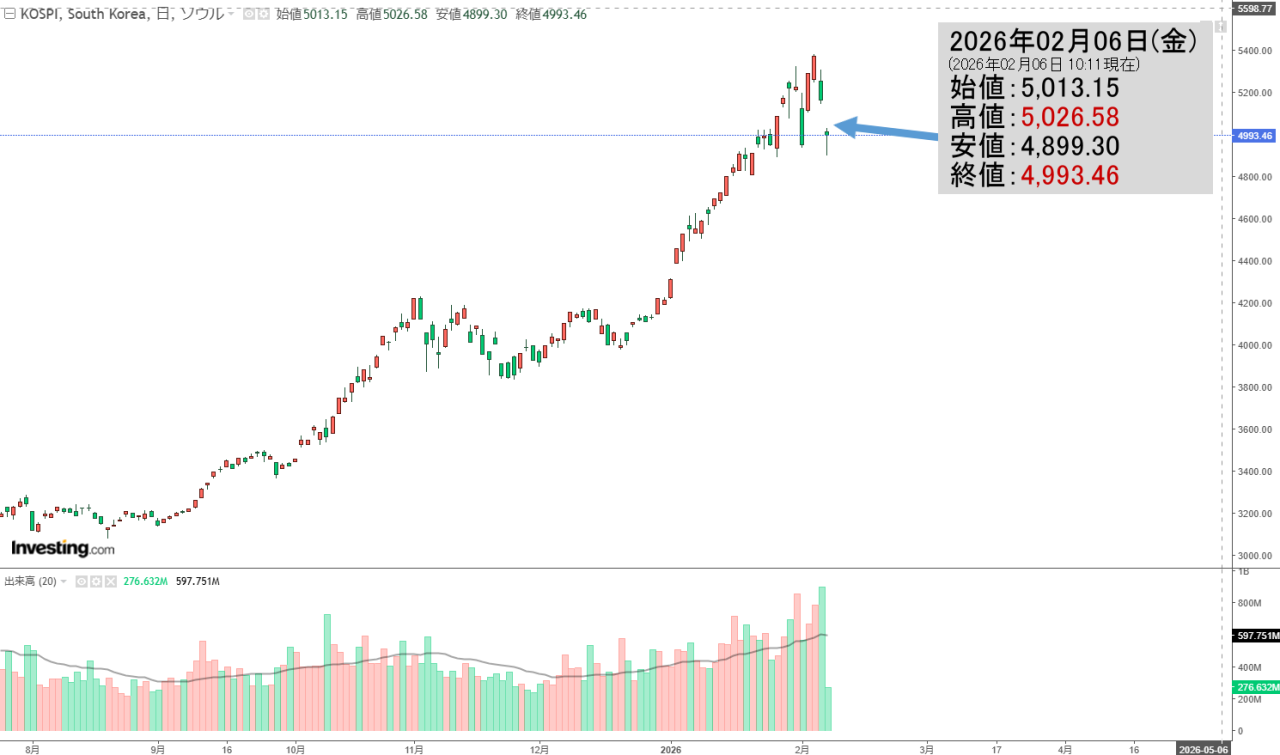 「韓国株式市場」02月06日(金)初動・KOSPI「4,993」ギャップダウン! 5,000割れ!