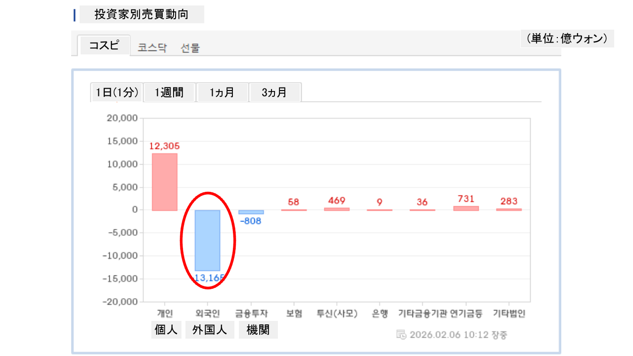 個人投資家は「1兆2,306億ウォン」の買い越し外国人投資家は「1兆3,165億ウォン」の売り越しです。